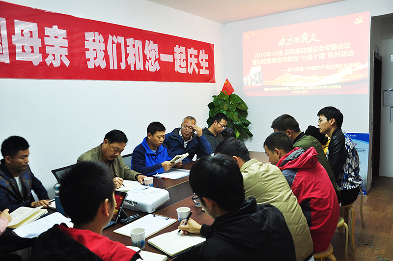 10月19日,為堅持全面從嚴(yán)治黨,杜絕貪腐現(xiàn)象的滋生,湖北路橋鄖西PPP項目積極響應(yīng)集團(tuán)公司黨委的廉政號召,組織開展了2018年10月黨風(fēng)廉政建設(shè)專題會議暨紀(jì)檢監(jiān)察宣傳教育“十進(jìn)十建”系列活動。