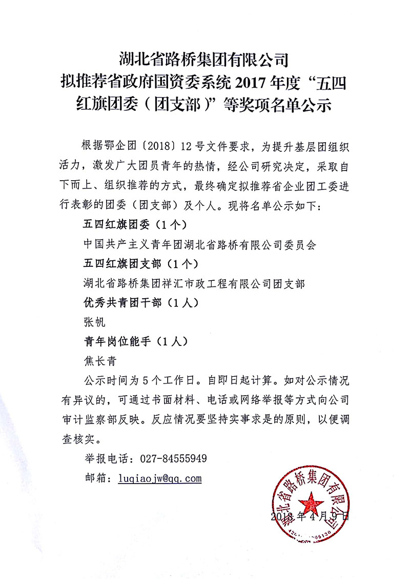 湖北省路橋集團(tuán)有限公司擬推薦省政府國(guó)資委系統(tǒng)2017年度”五四紅旗團(tuán)委(團(tuán)支部)“等獎(jiǎng)項(xiàng)名單公示