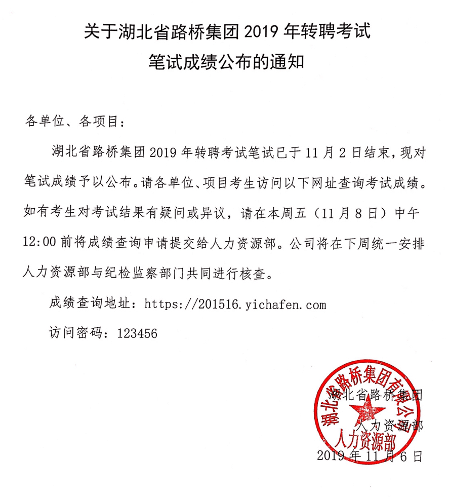關(guān)于湖北省路橋集團(tuán)2019年轉(zhuǎn)聘考試筆試成績公布的通知