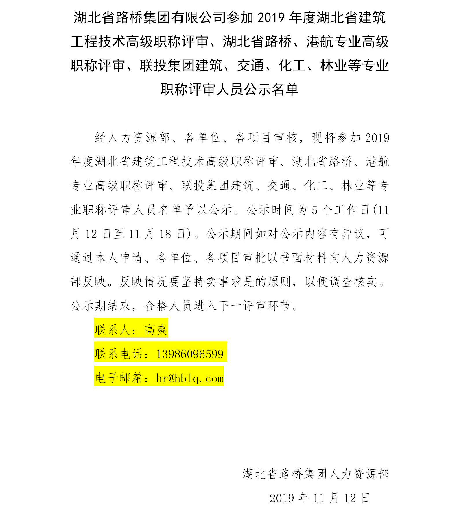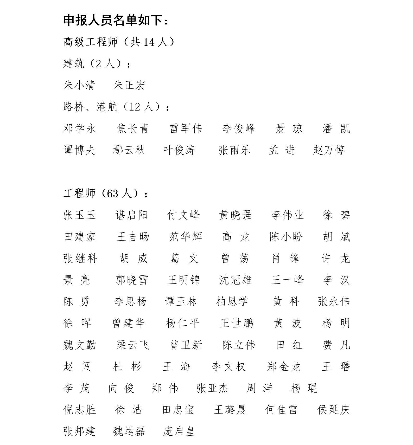 湖北省路橋集團(tuán)有限公司參加2019年度湖北省建筑工程技術(shù)高級(jí)職稱(chēng)評(píng)審、湖北省路橋、港航專(zhuān)業(yè)高級(jí)職稱(chēng)評(píng)審、聯(lián)投集團(tuán)建筑、交通、化工、林業(yè)等專(zhuān)業(yè)職稱(chēng)評(píng)審人員公示名單