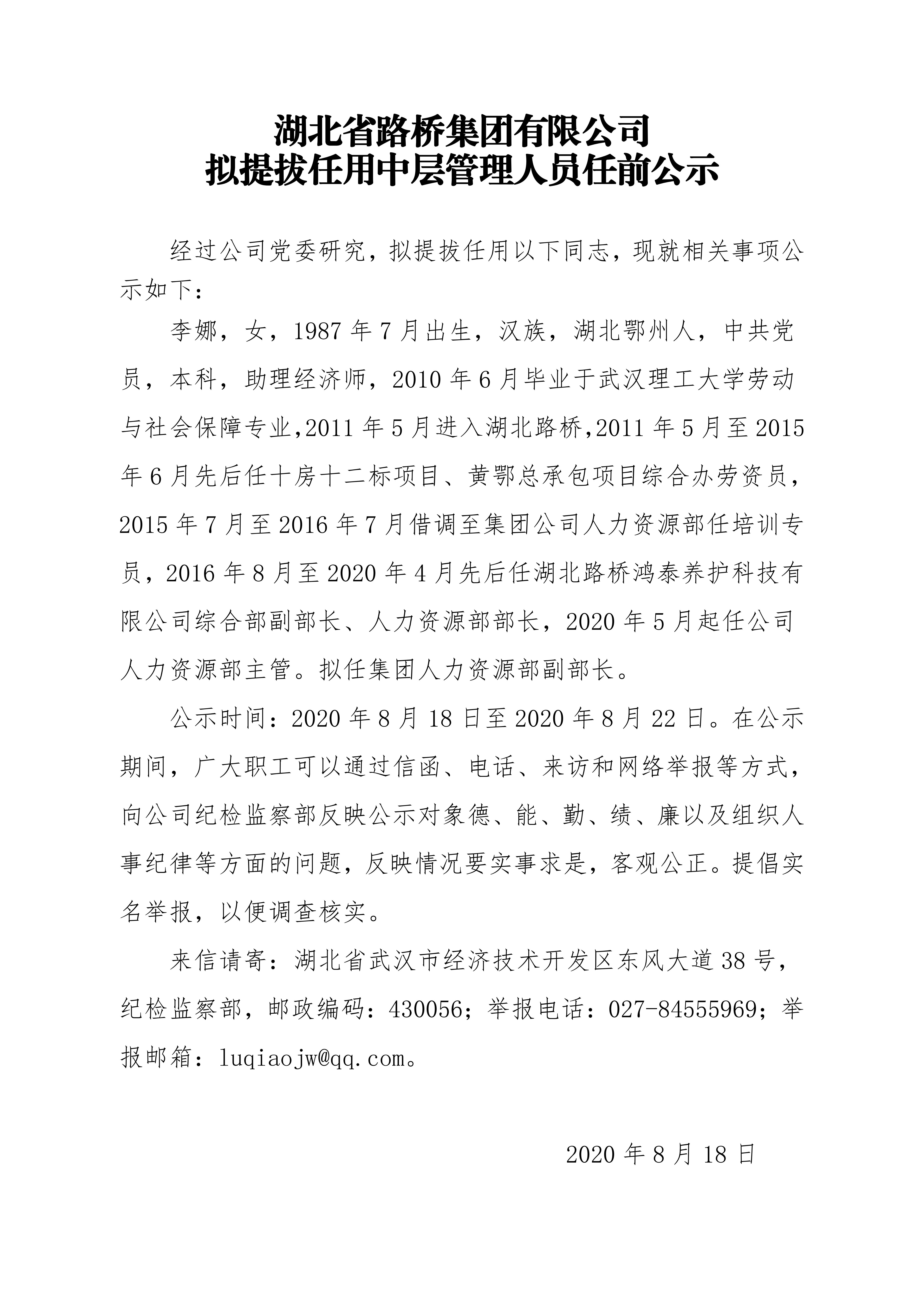 湖北省路橋集團(tuán)有限公司擬提拔任用中層管理人員任前公示