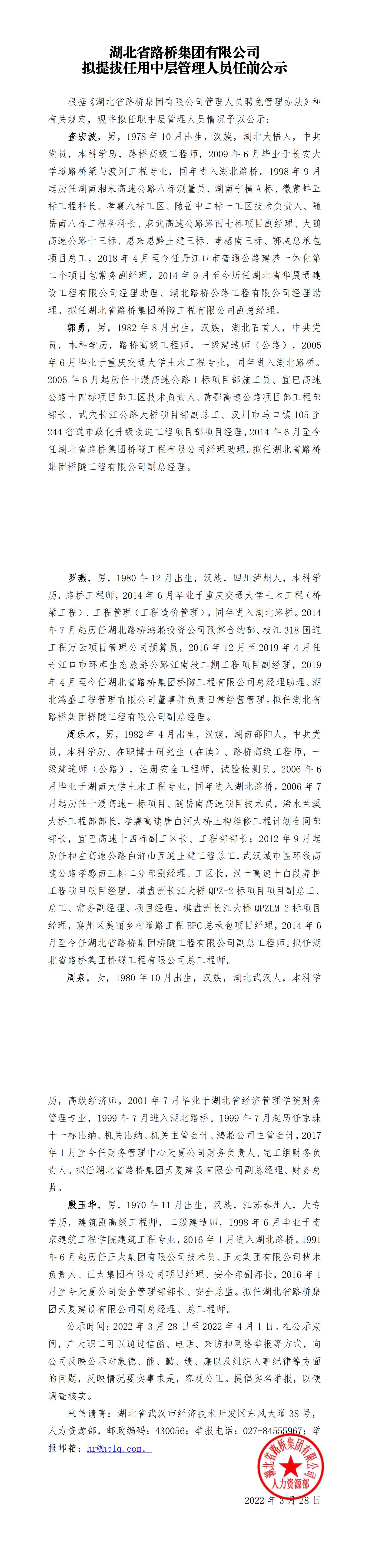 湖北省路橋集團(tuán)有限公司擬提拔任用中層管理人員任前公示