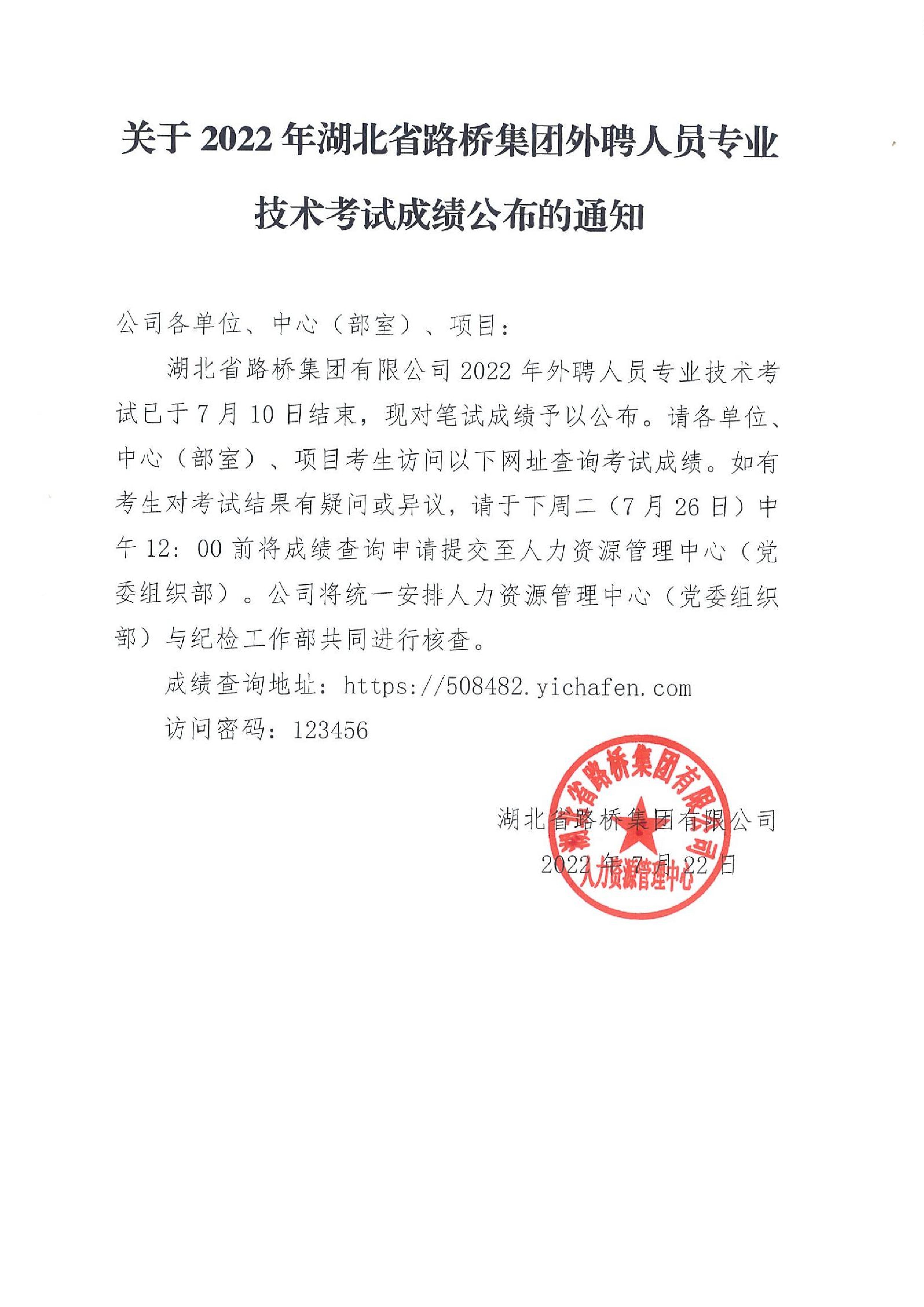 關(guān)于2022年湖北省路橋集團(tuán)外聘人員專業(yè)技術(shù)考試成績(jī)公布的通知