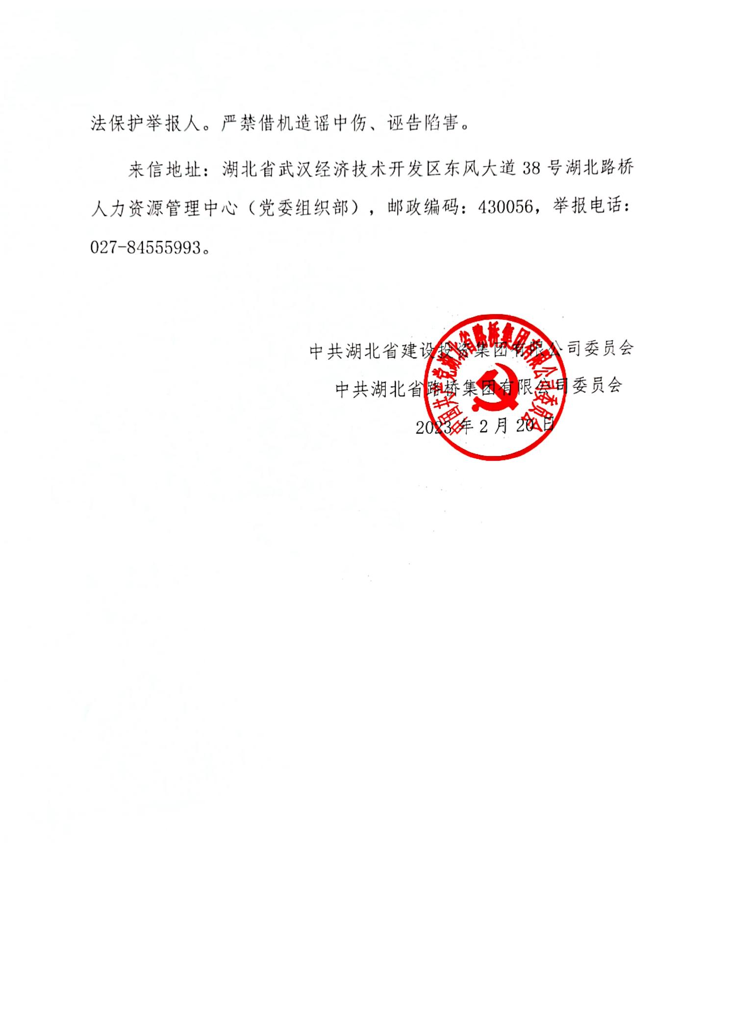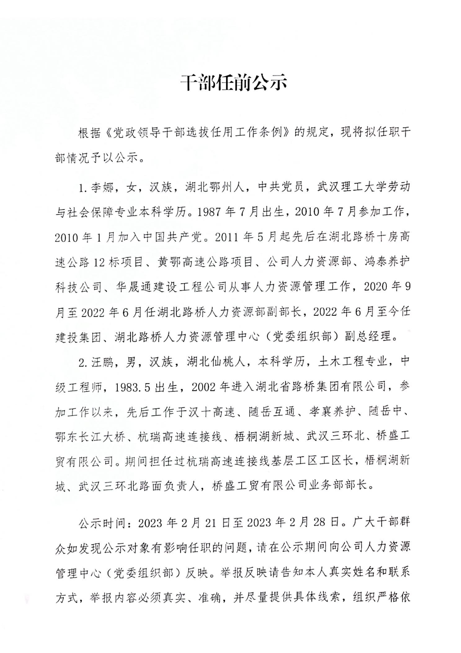 湖北省路橋集團有限公司擬提拔任用管理人員任前公示