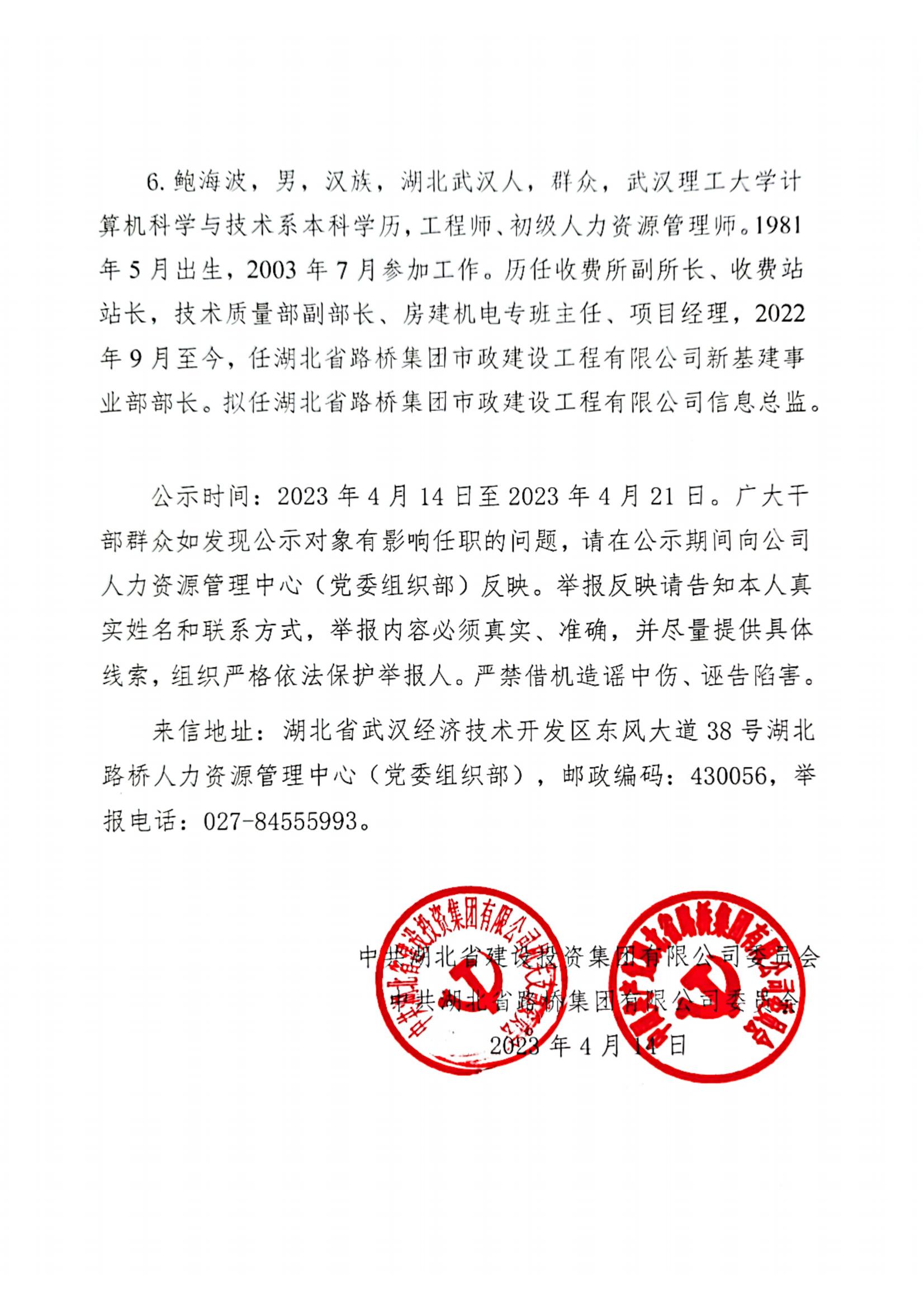 湖北省路橋集團(tuán)有限公司擬提拔任用中層管理人員任前公示