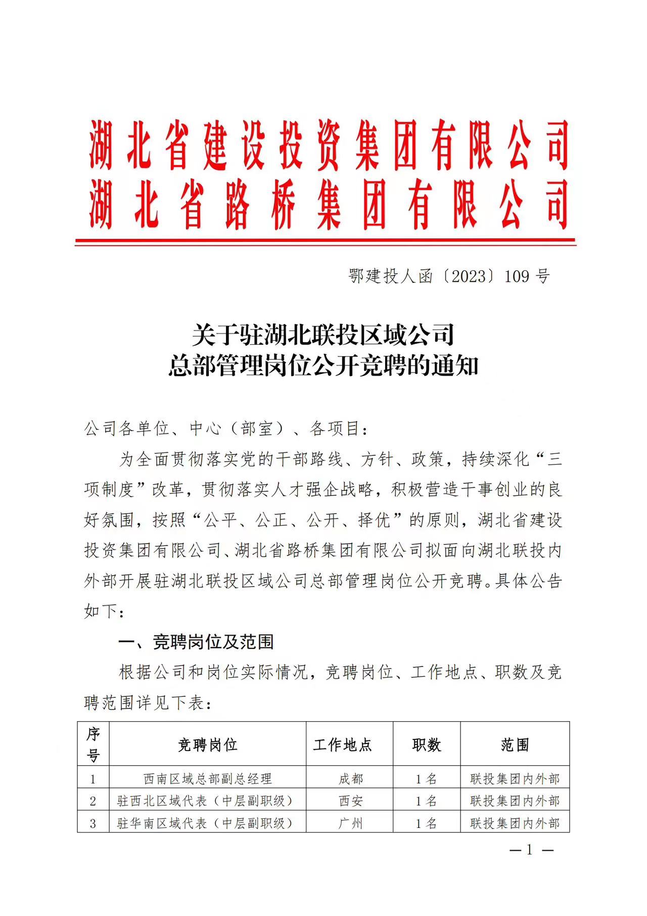 關(guān)于駐湖北聯(lián)投區(qū)域公司總部管理崗位公開競(jìng)聘的通知