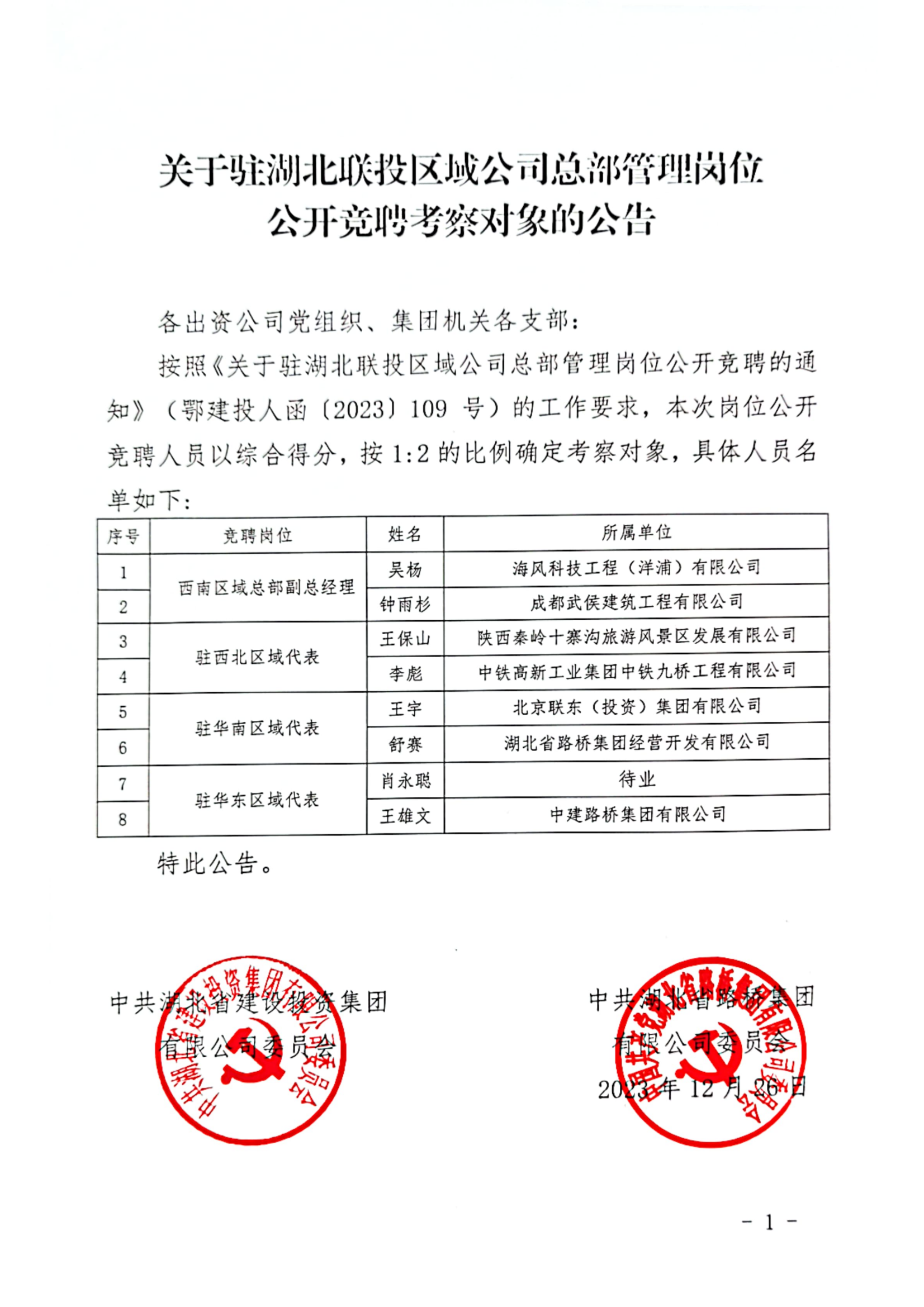湖北省建設(shè)投資集團(tuán)有限公司、湖北省路橋集團(tuán)有限公司駐湖北聯(lián)投區(qū)域公司總部管理崗位公開競(jìng)聘報(bào)名初審公示