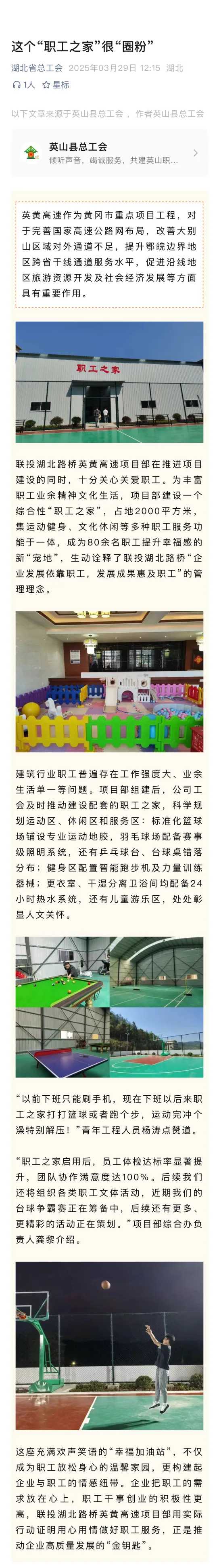 聯(lián)投湖北路橋英黃高速項(xiàng)目部在推進(jìn)項(xiàng)目建設(shè)的同時(shí),十分關(guān)心關(guān)愛職工。為豐富職工業(yè)余精神文化生活,項(xiàng)目部建設(shè)一個(gè)綜合性“職工之家”,占地2000平方米,集運(yùn)動健身、文化休閑等多種職工服務(wù)功能于一體,成為80余名職工提升幸福感的新“寵地”,生動詮釋了聯(lián)投湖北路橋“企業(yè)發(fā)展依靠職工,發(fā)展成果惠及職工”的管理理念。近日,湖北省總工會進(jìn)行深入報(bào)道,全文如下: