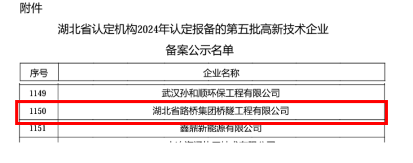 1月15日,全國高新技術(shù)企業(yè)認(rèn)定管理工作領(lǐng)導(dǎo)小組辦公室發(fā)布了湖北省2024年第五批國家高新技術(shù)企業(yè)的備案名單,聯(lián)投湖北路橋橋隧公司通過認(rèn)定,正式邁入國家高新技術(shù)企業(yè)行列。這標(biāo)志著橋隧公司在科技創(chuàng)新發(fā)展道路上取得新的里程碑,開啟企業(yè)發(fā)展的新篇章。