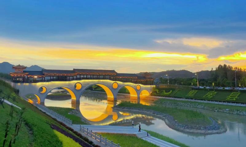 西河拱橋位于老西河拱橋北面,全長(zhǎng)106m,采用27+37+27m上承式鋼筋混凝土拱橋結(jié)構(gòu),橋拱采用古風(fēng)古韻的風(fēng)雨廊橋造型,與房縣《詩(shī)經(jīng)》文化遙相呼應(yīng)。