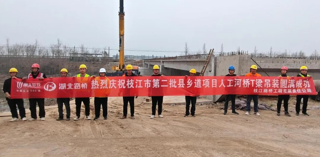 3月1日,隨著最后一片T梁精準(zhǔn)落位,枝江路橋第二批縣鄉(xiāng)道改造工程順利完成了龍葵線東段人工河橋T梁吊裝任務(wù)。這一關(guān)鍵節(jié)點的突破,標(biāo)志著人工河橋梁主體結(jié)構(gòu)施工取得重大進(jìn)展,為后續(xù)橋面鋪裝及實現(xiàn)通車目標(biāo)奠定了堅實基礎(chǔ)。